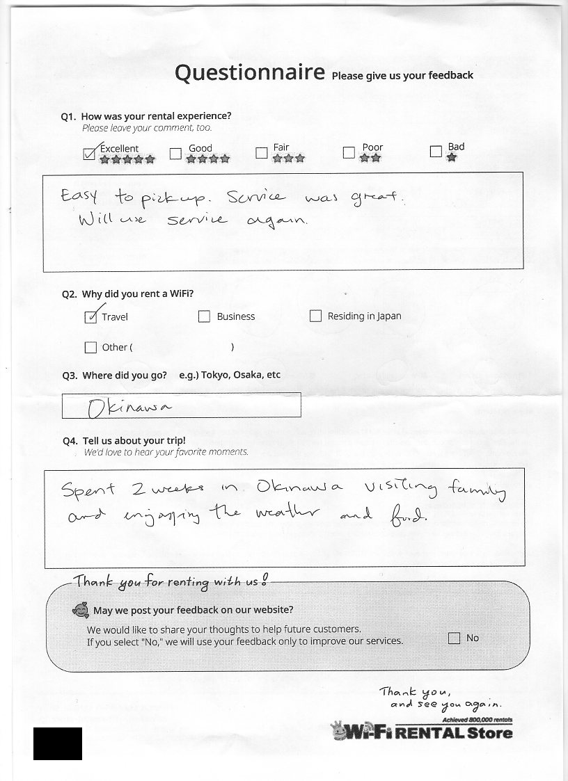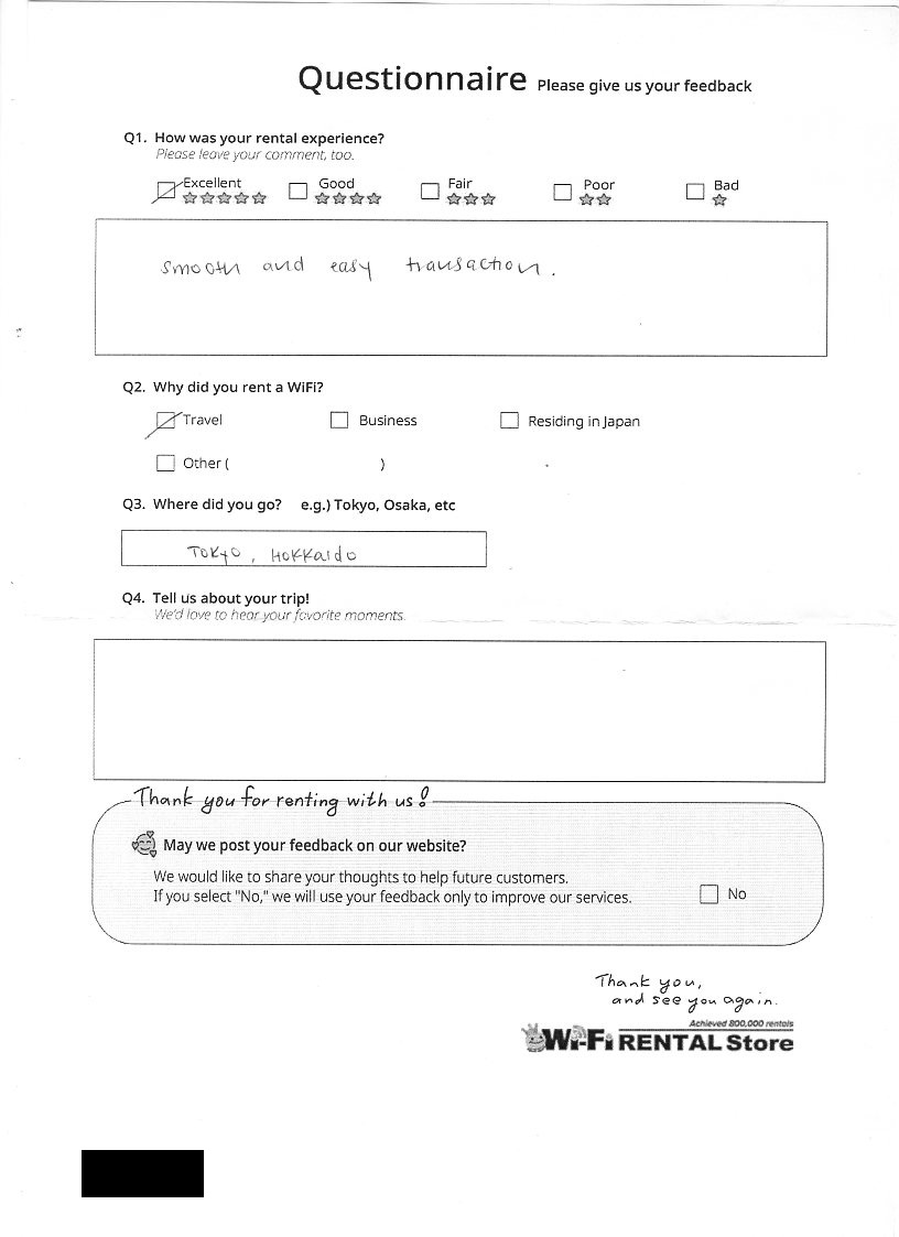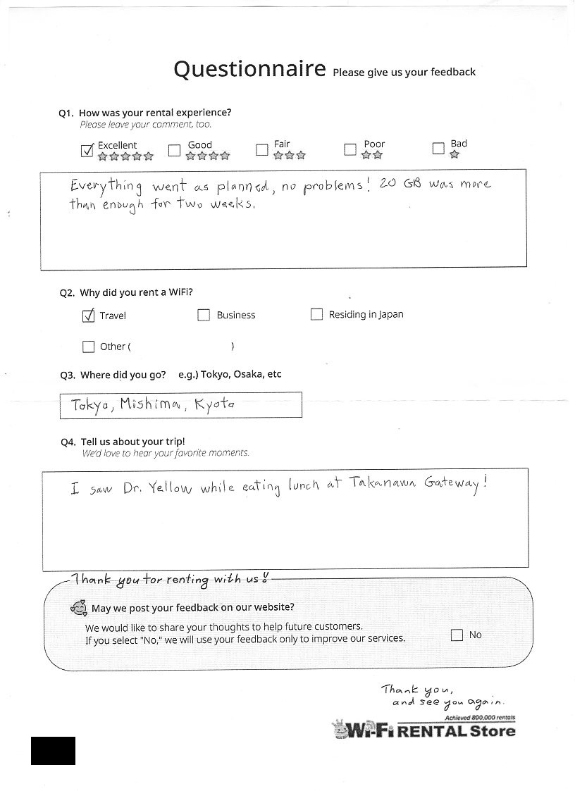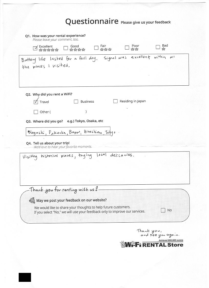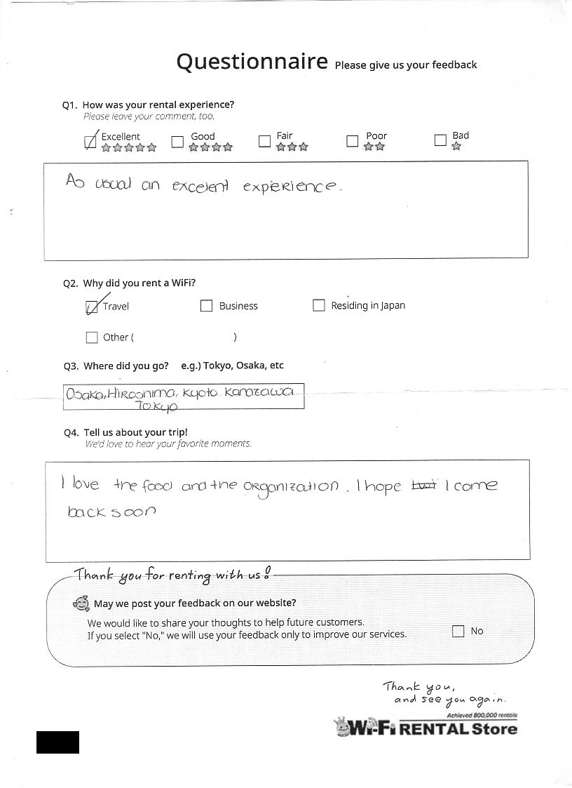 Excellent service and WiFi worked great!I would recommend your service to anyone travelling to Japan.